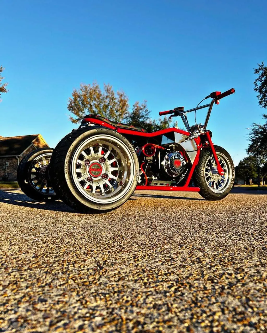 When “nice trike” isn’t enough and you want the head-turner, you build something like Flash. With its high-impact red frame, polished multi-spoke wheels, and low, stretched profile, this machine brings true show-car energy to the street.